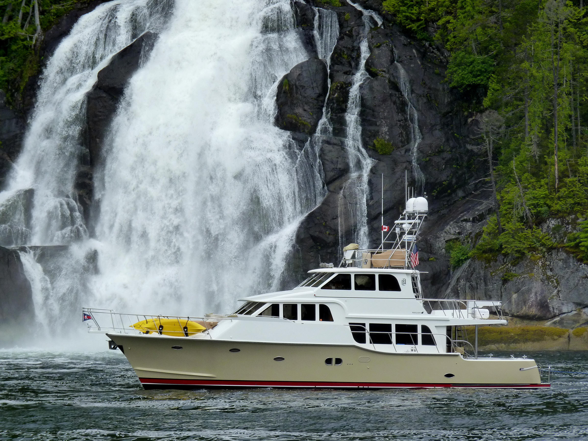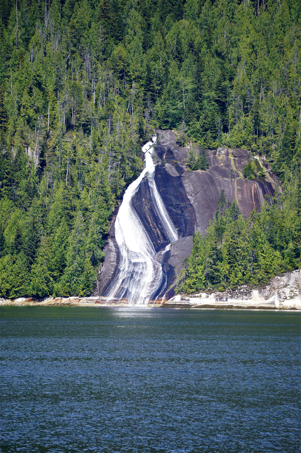 ![]() A wonderful 100' Wide waterfall as we leave Kwatsi Bay |