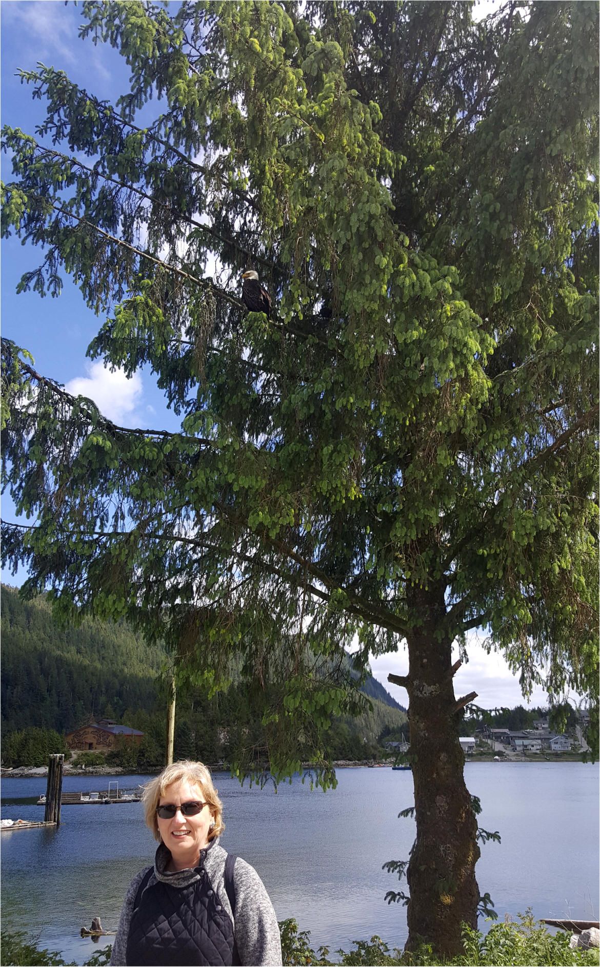 ![]() The spectacular long house at Klemtu with an eagle keeping a keen eye on us. |